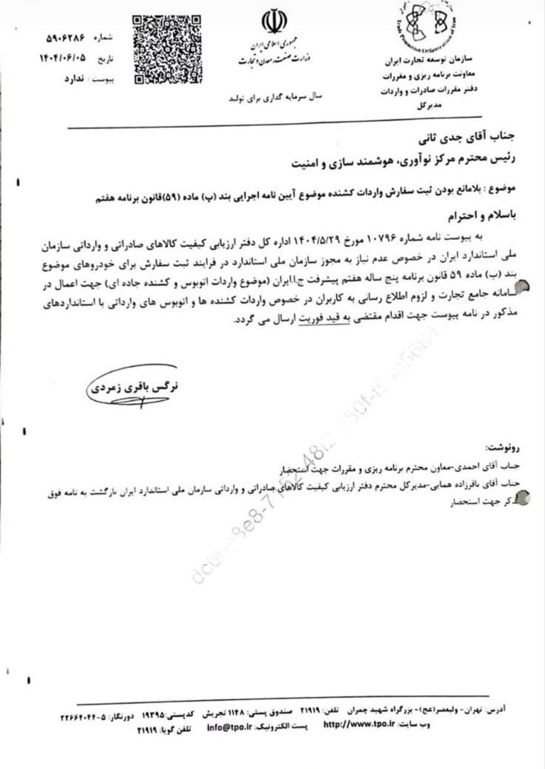 یک تغییر مهم در مقررات وارداتی ایران اعلام شده است که فرآیند ثبت سفارش خودروهای سنگین را ساده‌تر می‌کند. بر اساس نامه رسمی سازمان توسعه تجارت ایران، از این پس واردکنندگان می‌توانند ثبت سفارش واردات کشنده‌ها (کامیون‌های کشنده) و اتوبوس‌های جاده‌ای را بدون نیاز به دریافت مجوز از سازمان ملی استاندارد انجام دهند. این تصمیم در راستای اجرای بند «پ» ماده ۵۹ قانون برنامه هفتم توسعه و مصوبات دولت اتخاذ شده و هدف آن تسهیل واردات خودروهای سنگین برای نوسازی ناوگان حمل‌ونقل کشور است. در ادامه به شرح این تصمیم، دلایل و تأثیرات آن بر روند واردات می‌پردازیم.